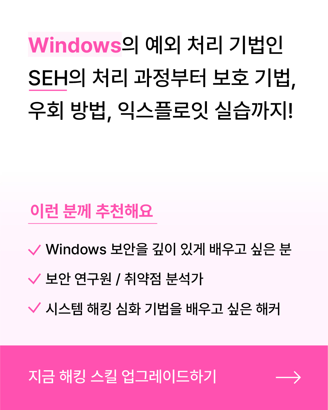 전세계에서 가장 널리 쓰이는 운영체제인 Windows, 그만큼 현업에서도 Windows 상에서의 보안 역량을 더욱 더 많이 필요로 하고 있습니다. 운영체제 상에서의 보안에 관심이 있으신 분들, 그리고 시스템 해킹의 더욱 더 깊은 곳에 뛰어들고 싶으신 분들은 이번에 추가된 두 유닛들을 놓치지 마시길 바랍니다!