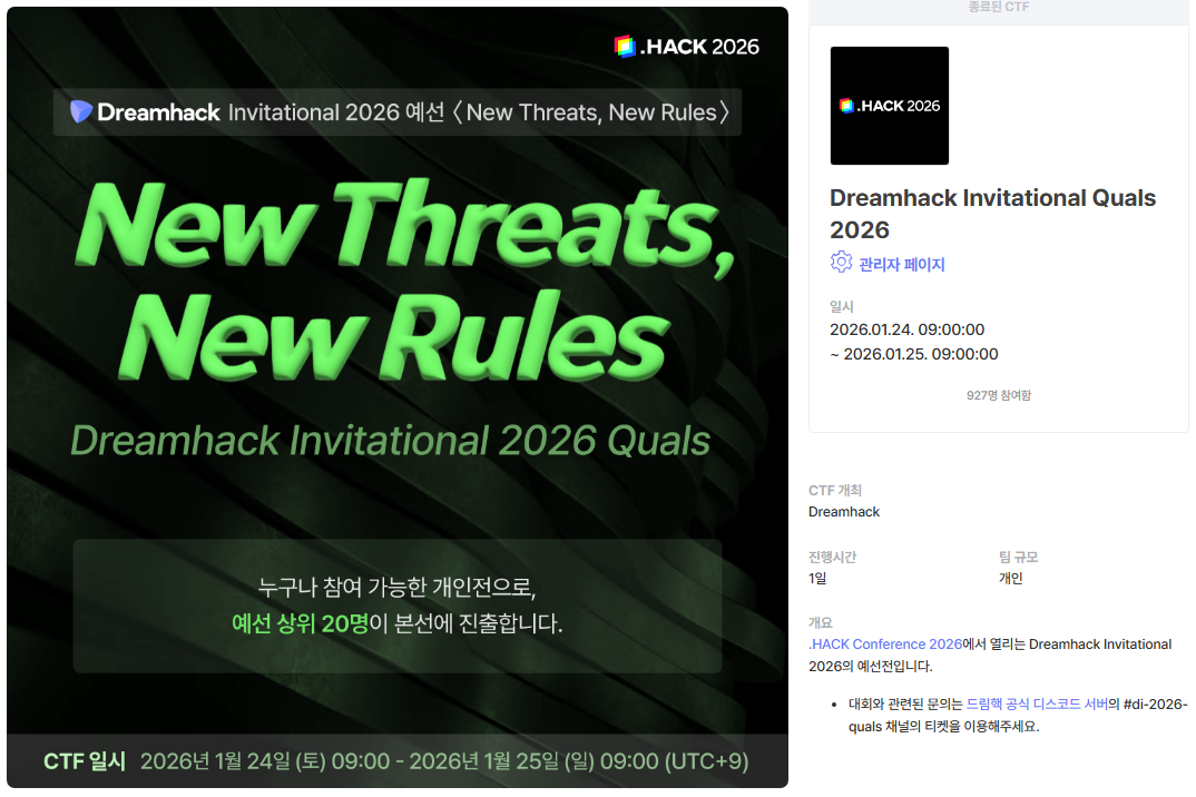 마지막으로 전달 드릴 소식은 Dreamhack Invitational 2026 Quals입니다!