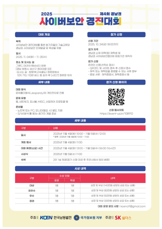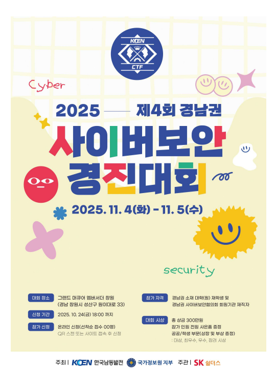 2025년 제4회 경남권 사이버보안 경진대회 개최하오니, 경남권 대학생(원) 많은 참여 부탁드립니다.
