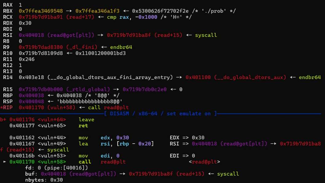 로컬에서 write(0, read_got, 0x30) 실행은 성공하였습니다