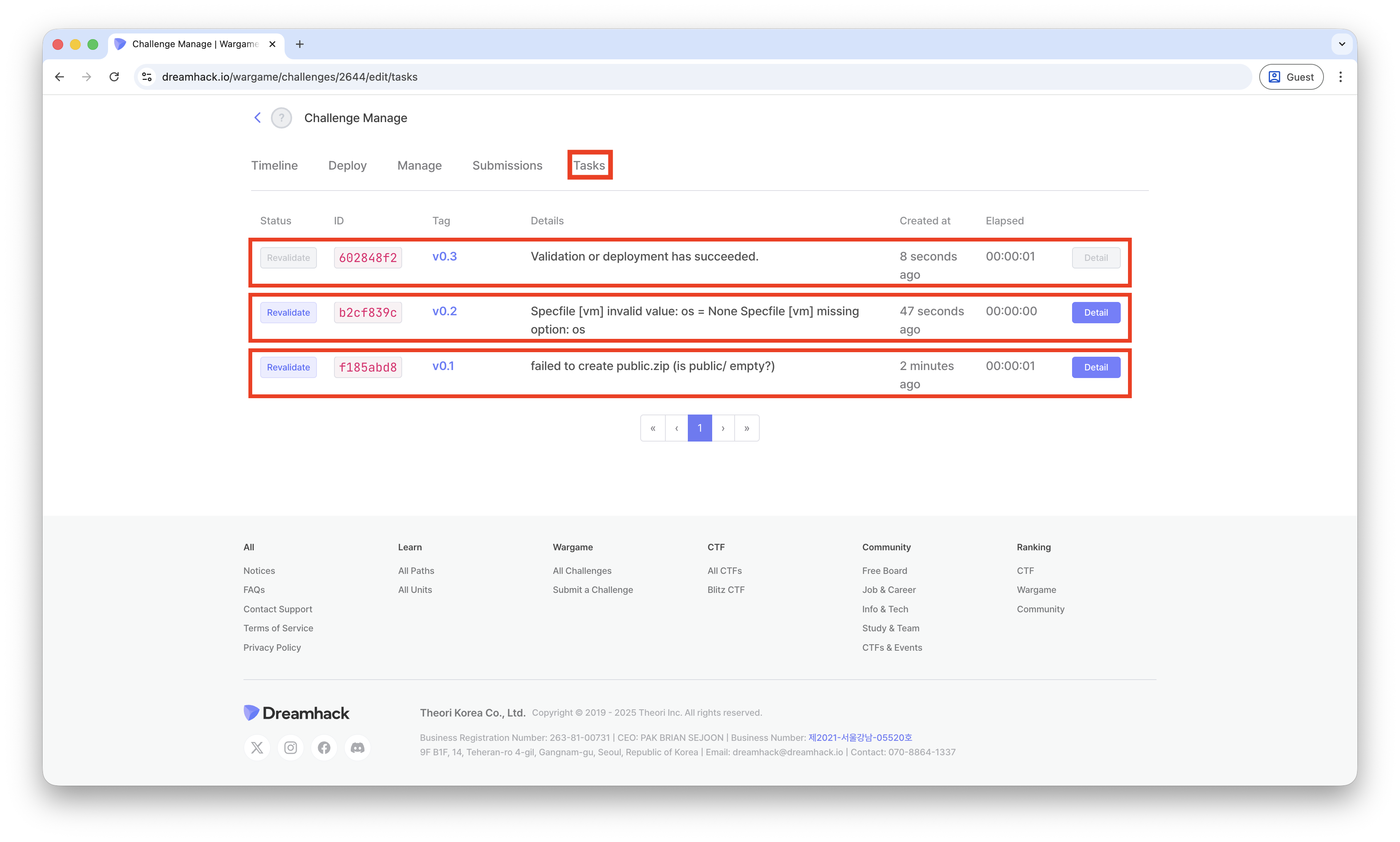 검증 여부는 아래 사진과 같이 Tasks 탭에서 확인할 수 있습니다. 만약 검증에 실패하는 경우 실패 사유가 표시되며, 우측의 Detail 버튼을 눌러서 자세한 로그를 확인할 수 있습니다.