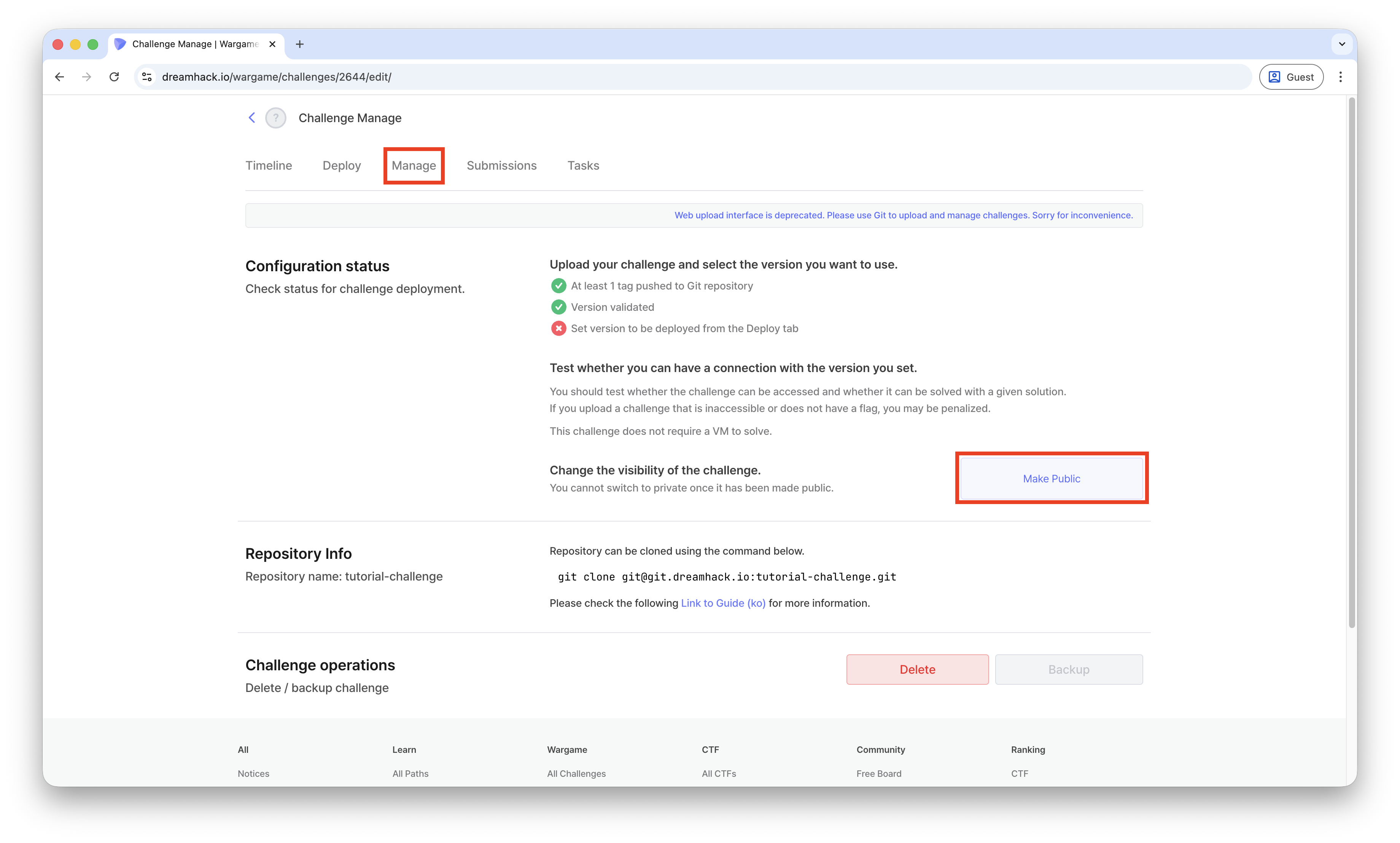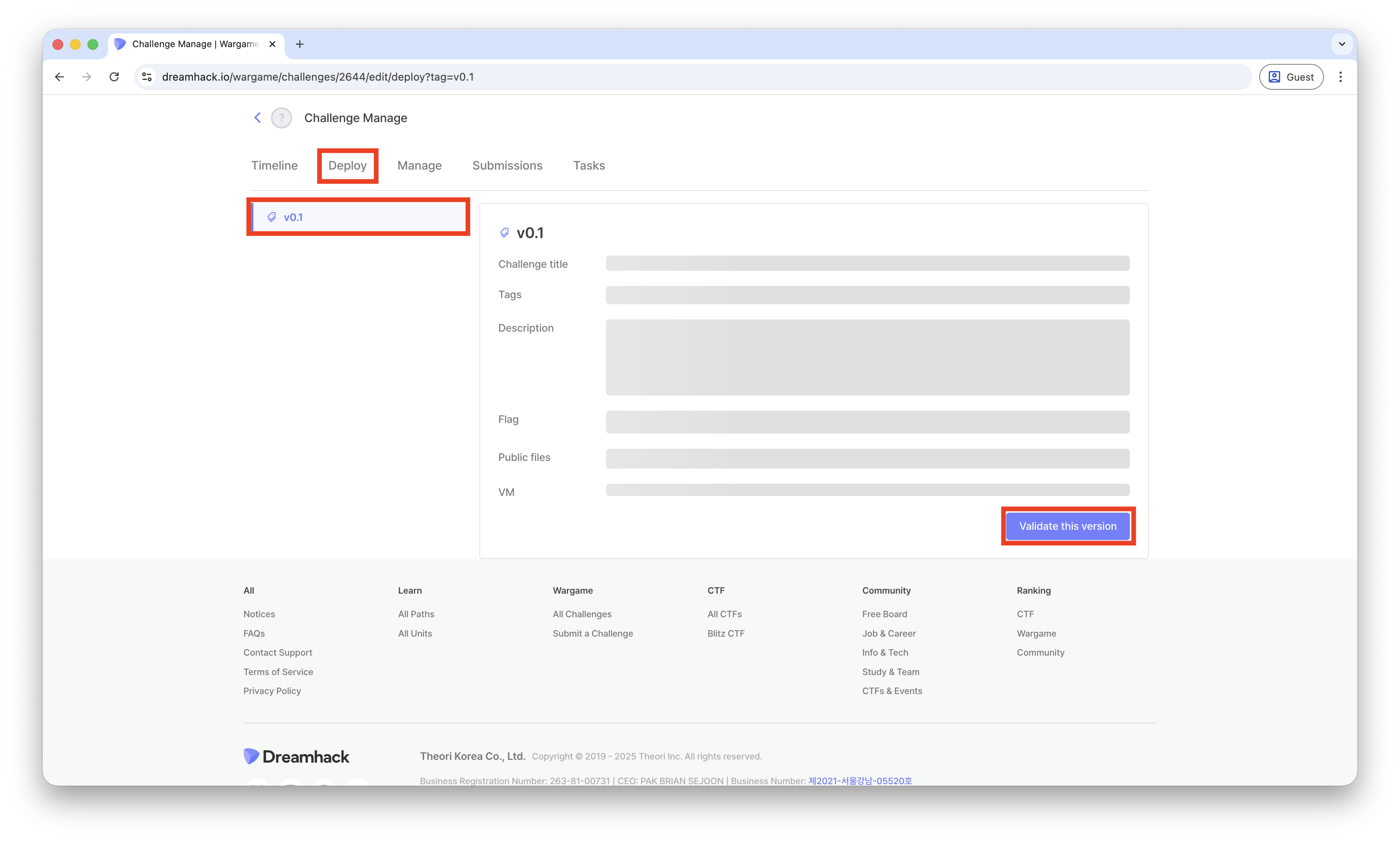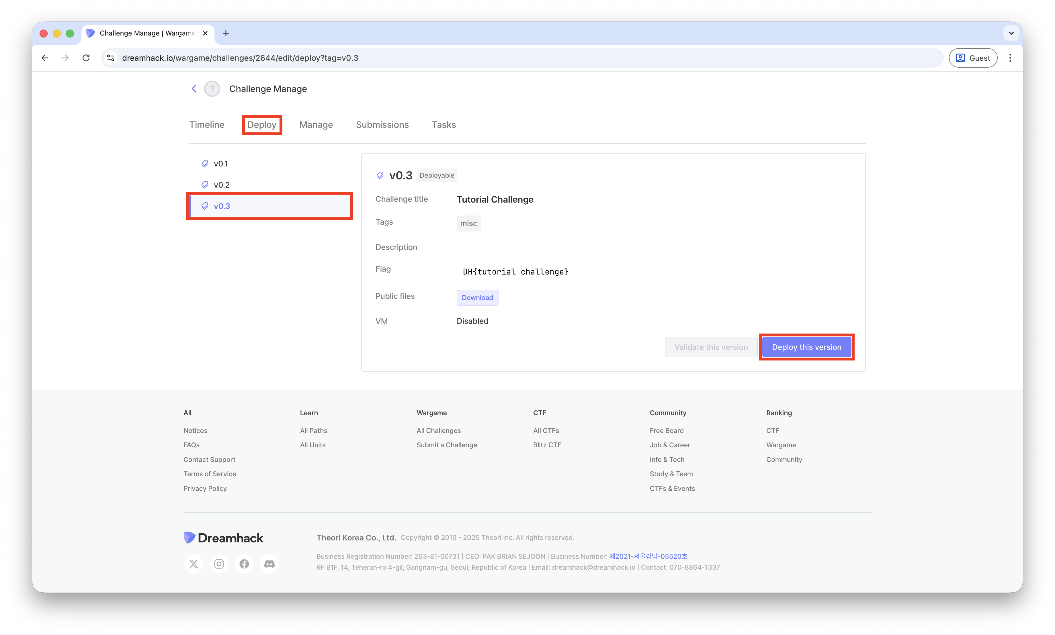 검증에 성공하였으면 아래 사진과 같이 다시 Deploy 탭으로 돌아와서 해당하는 태그를 누른 후 배포 버튼을 눌러 문제를 배포할 수 있습니다.