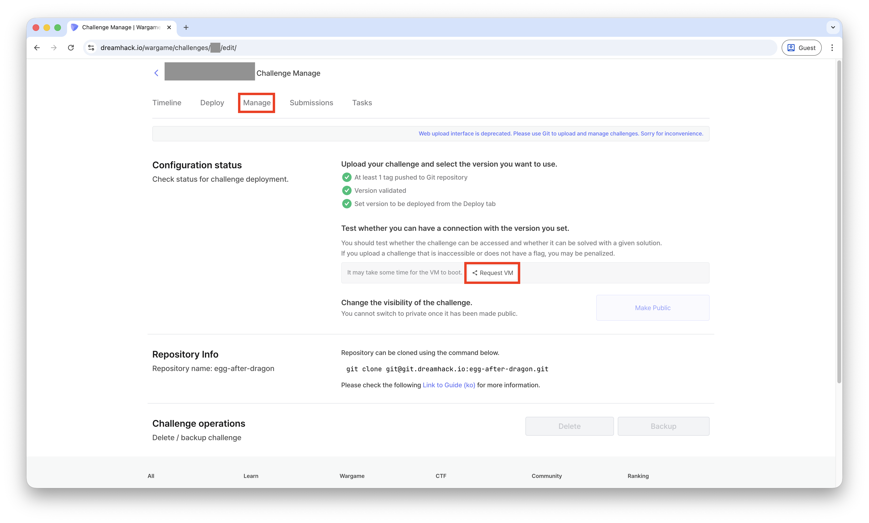 워게임 문제는 내부적으로 Git 리포지토리 형태로 관리됩니다. 문제를 만들기 위해 가장 먼저 해야 할 일은 문제에 사용할 Git 리포지토리 이름을 지정하는 것입니다. 위 사진에서 아래쪽 빨간 네모로 표시된 부분에 워게임 문제가 사용할 Git 리포지토리 이름을 입력해주세요.